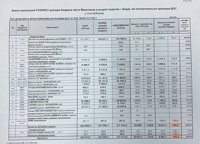 — Не могу не отреагировать на высказывание нашего мэра о том, что бюджет Николаева недополучил в январе около 30% поступлений. Звучит это, мягко выражаясь странно, учитывая, что на сайте городского совета размещена информация о поступлениях в бюджет города на уровне 106% и 102% по разным статьям. Ниже прилагаю нашу сводную таблицу налоговой службы, в которой видны поступления в городской бюджет по видам налогов. Видно, например, что минус по земельном налогу физических лиц перекрыт поступлениями по земельному налогу от юридических лиц, а по единому налогу наоборот, поступления от физических лиц перекрыли минус по единому налогу от предприятий. Итоговое выполнение составило 104.3%, поэтому, либо мэр имел ввиду не налоговые поступления, а какие то субвенции или что то еще, либо ему предоставили неправильную информацию, которую надо проверять. Большая просьба к Александру Сенкевич все таки подробнее объяснить плательщикам налогов и жителям города, что имелось в виду и про какие 30% он говорил! Спасибо заранее!,- написал Дмитрий Прокофьев.