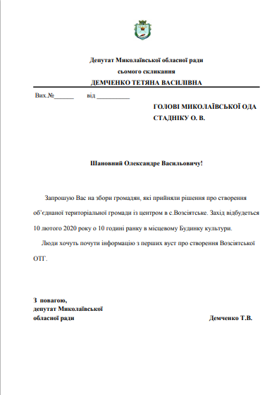 «Люди хотят услышать информацию из первых уст о создании Воссиятского ОТГ», - говорится в документе.