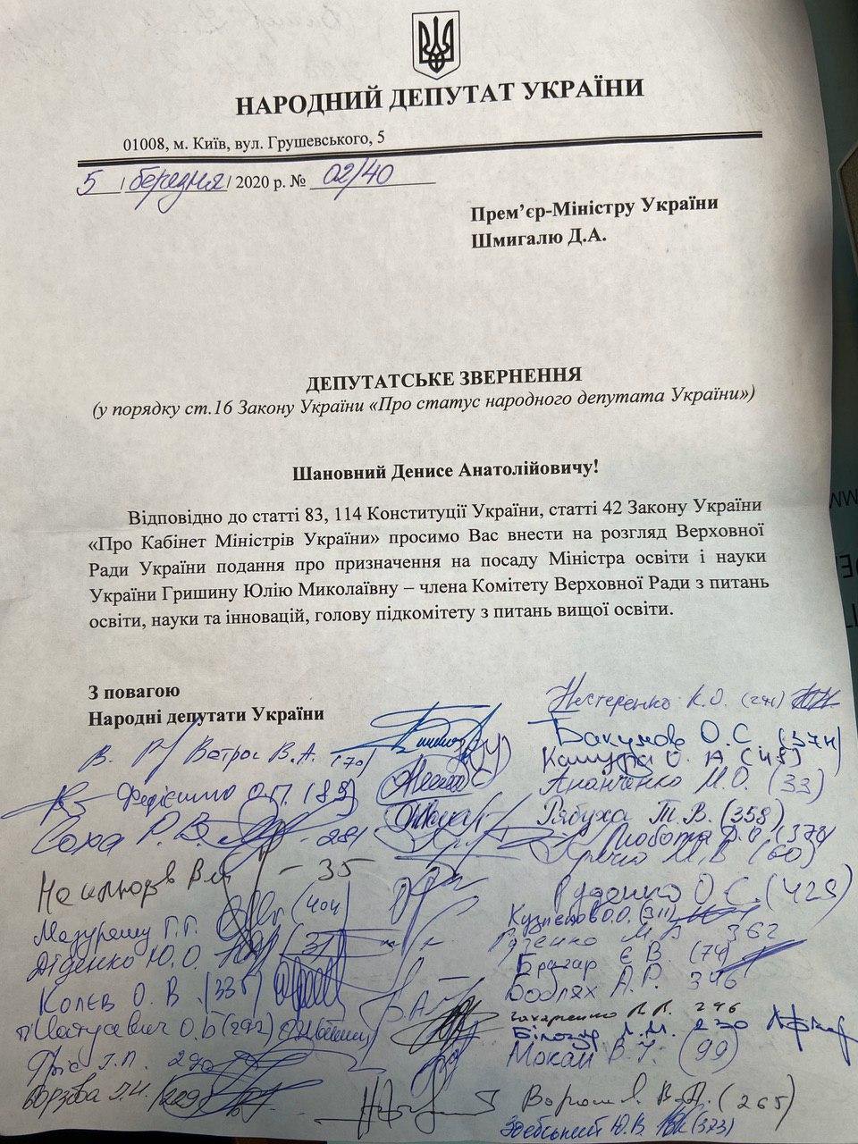 — Согласно со статьей 83,114 Конституции Украины, статьи 42 закона «О Кабинете министров», просим вас внести на рассмотрение Верховной Рады представление о назначении на должность министра образования и науки Гришину Юлию - члена Комитета Верховной Рады по вопросам образования, науки и инноваций, главу подкомитета по вопросам высшего образования, - говорится в обращении.