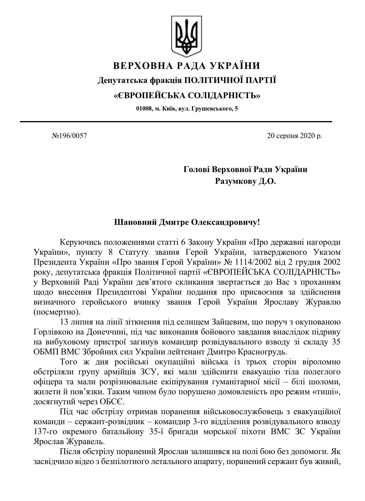 Парламентская фракция «Европейская Солидарность» призвала спикера Верховной Рады Дмитрия Разумкова внести представление президенту Владимиру Зеленскому о присвоении звания Героя Украины погибшему морпеху Ярославу Журавлю.