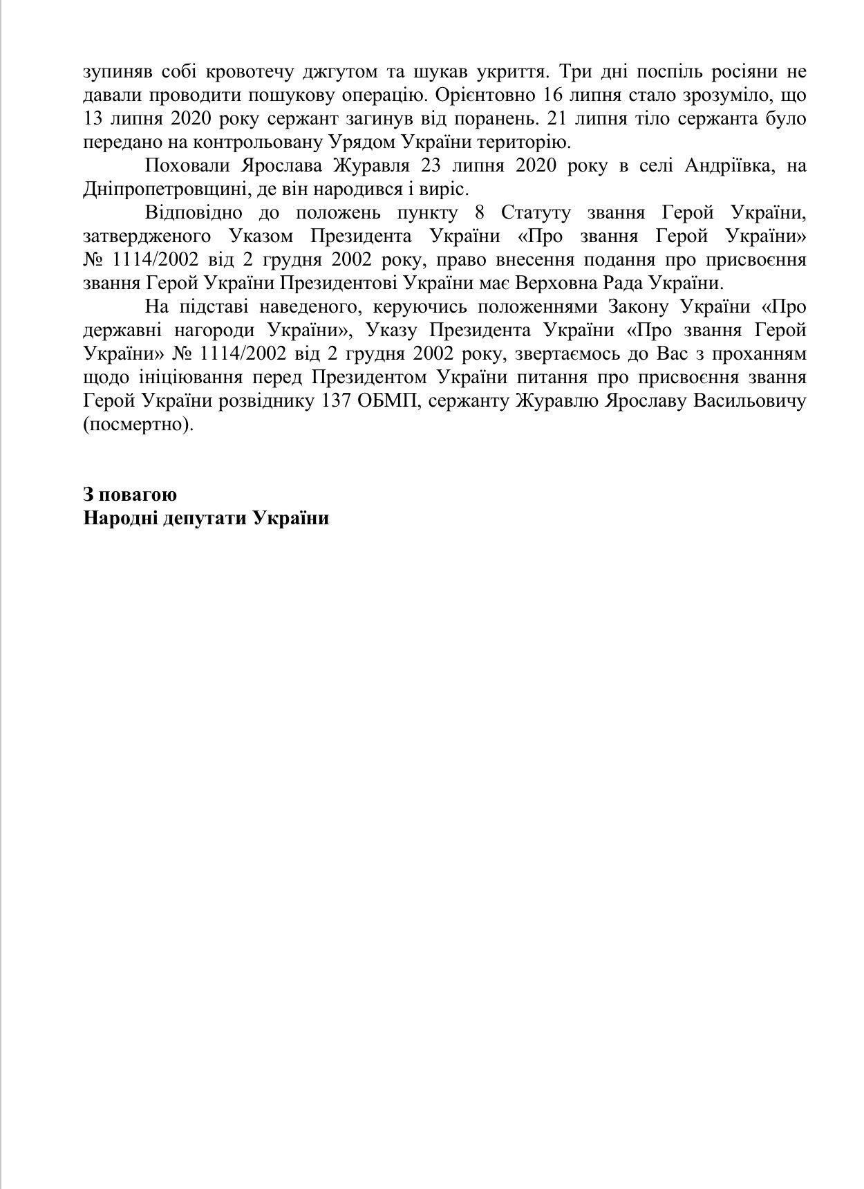 — Обращаемся к вам с просьбой об инициировании перед Президентом Украины вопроса о присвоении звания Герой Украины разведчику 137 ОБМП, сержанту Журавлю Ярославу Васильевичу (посмертно), - говорится в обращении к главе Верховной Рады.