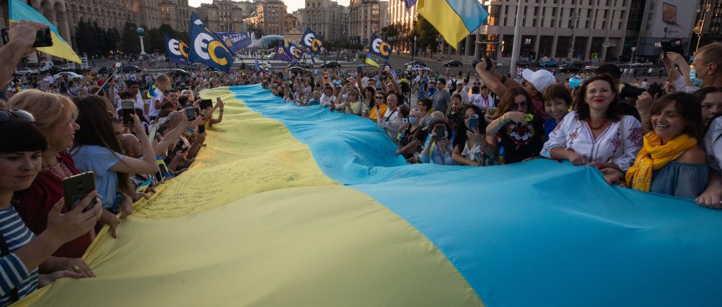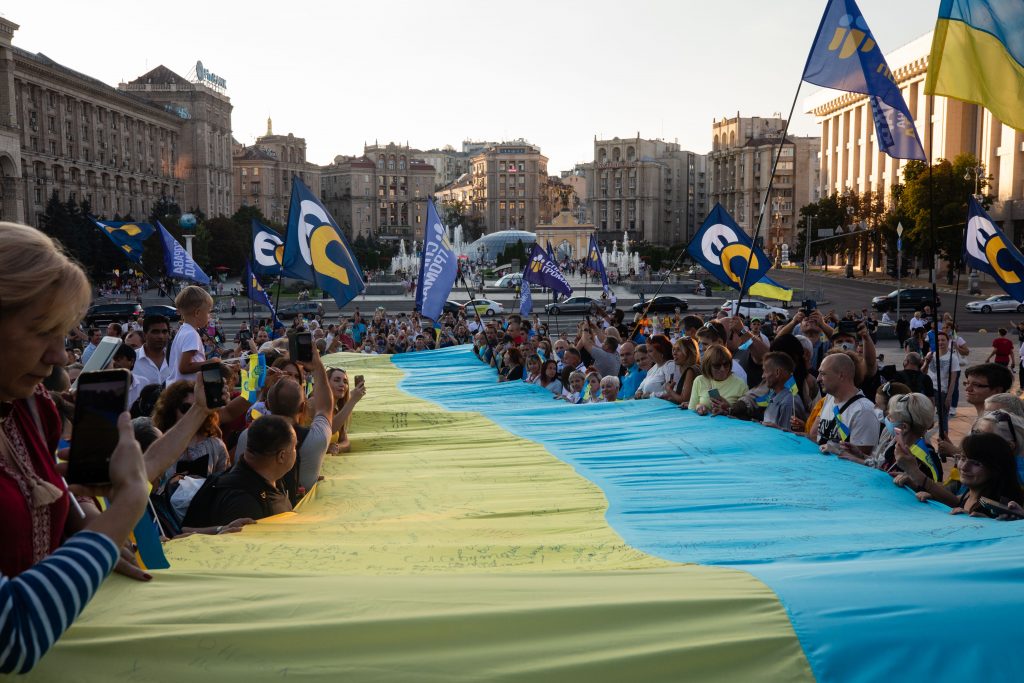 На Майдане Независимости в Киеве сотни активистов развернули Флаг Единства длиной 33 метра. Сине-желтый флаг, который благодаря инициативе активистов ОО «Справа громад» начал свой путь в Полтаве 20-метровым, путешествовал по всей Украине. Общественные активисты в 23 городах дошивали свои части и оставляли свои пожелания единства, свободы и победы.