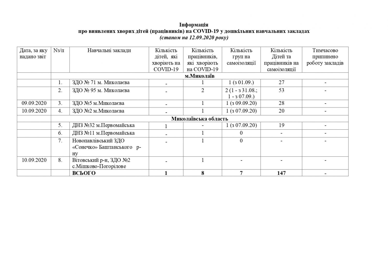 По состоянию на 12 сентября в учебных учреждениях Николаева зафиксировали 5 случаев заражения коронавирусной инфекцией COVID-19 среди детей и персонала.