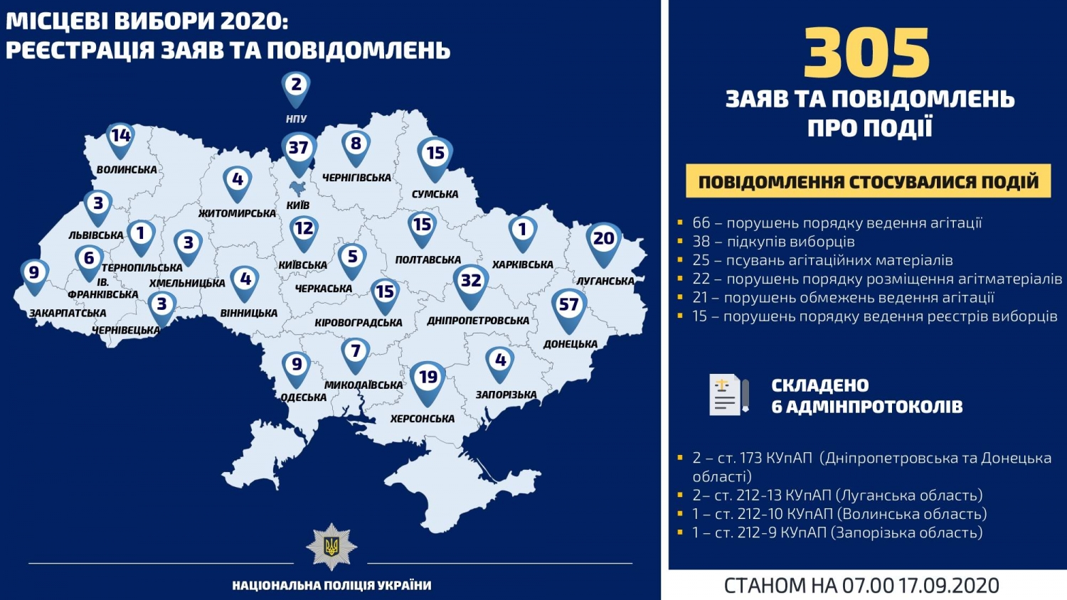 Больше всего сообщений о нарушениях законодательства зафиксированы в Киевской области — 4, в Днепропетровской — 3 , по 2 — в Луганской, Одесской, Черкасской и Полтавской, по 1 — в Винницкой, Волынской, Донецкой, Закарпатской, Николаевской, Сумской, Хмельницкой областях и в городе Киеве.