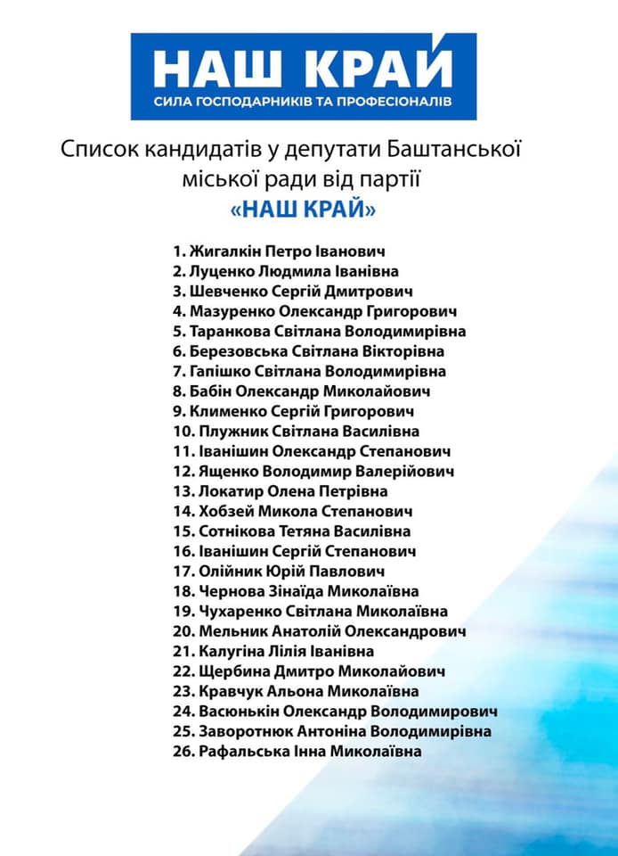 Партия «Наш край» в Николаевской области опубликовала список кандидатов в депутаты Баштанского городского совета.