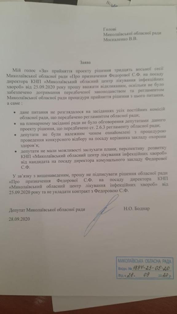 Спустя несколько дней после официального назначения Светланы Федоровой директором КНП «Николаевский областной центр лечения инфекционных болезней», депутат Николаевского облсовета Надежда Бондар отозвала свой голос.