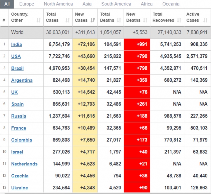В среду, 7 октября, мир пересек отметку в 36 миллионов случаев коронавируса, еще 4 октября сообщалось о 35 миллионах.