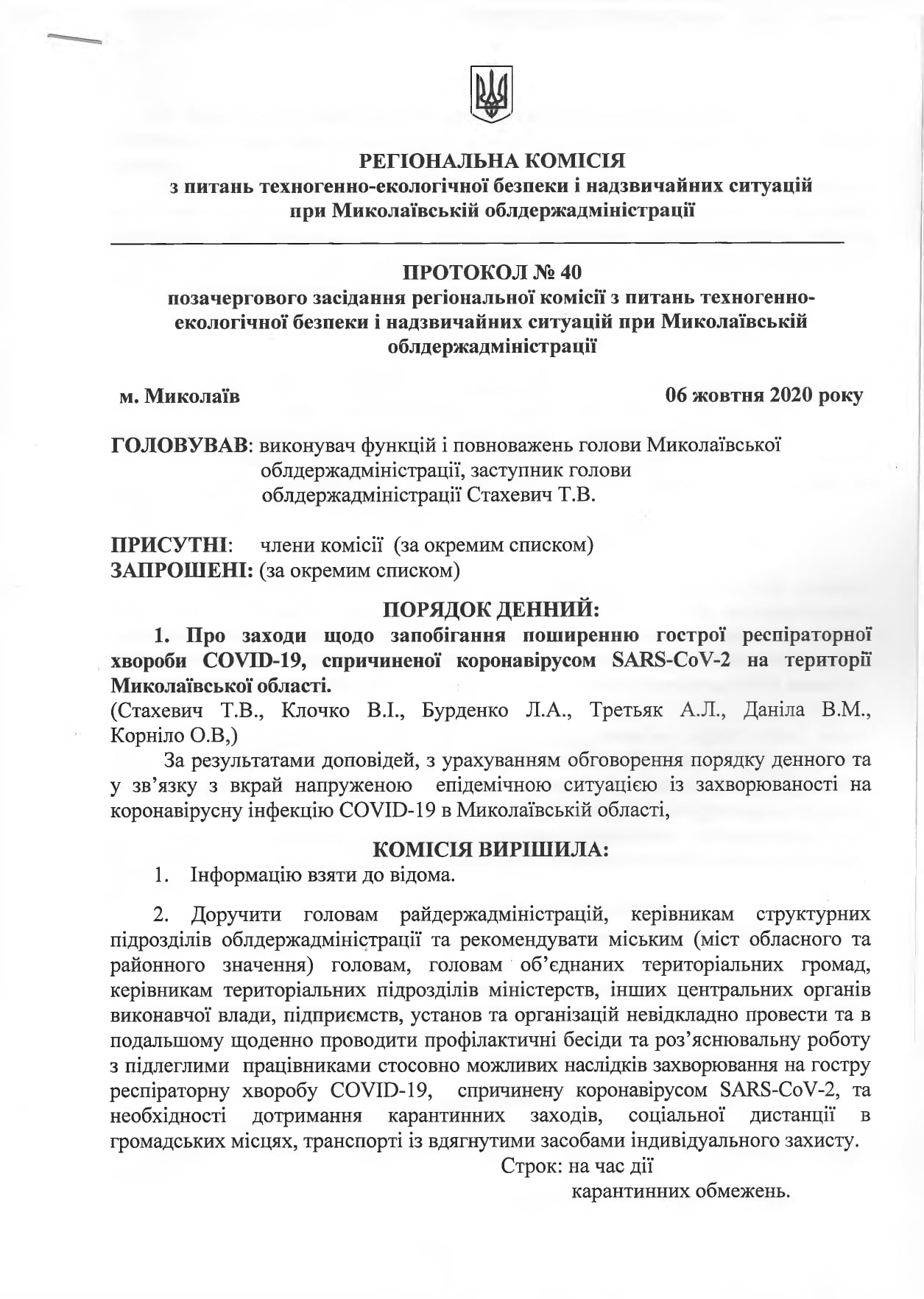 Учитывая изложенное, облгосадминистрация размещает протокол региональной комиссии по вопросам техногенно-экологической безопасности и чрезвычайных ситуаций при Николаевской облгосадминистрации от 06.10.2020 №40 оформленный в соответствии с установленными требованиями.