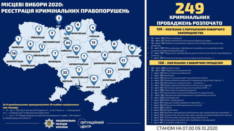 В целом, в Украине открыто 249 уголовных дел в связи с возможными нарушениями на местных выборах. За сутки правоохранители открыли 15 уголовных дел.