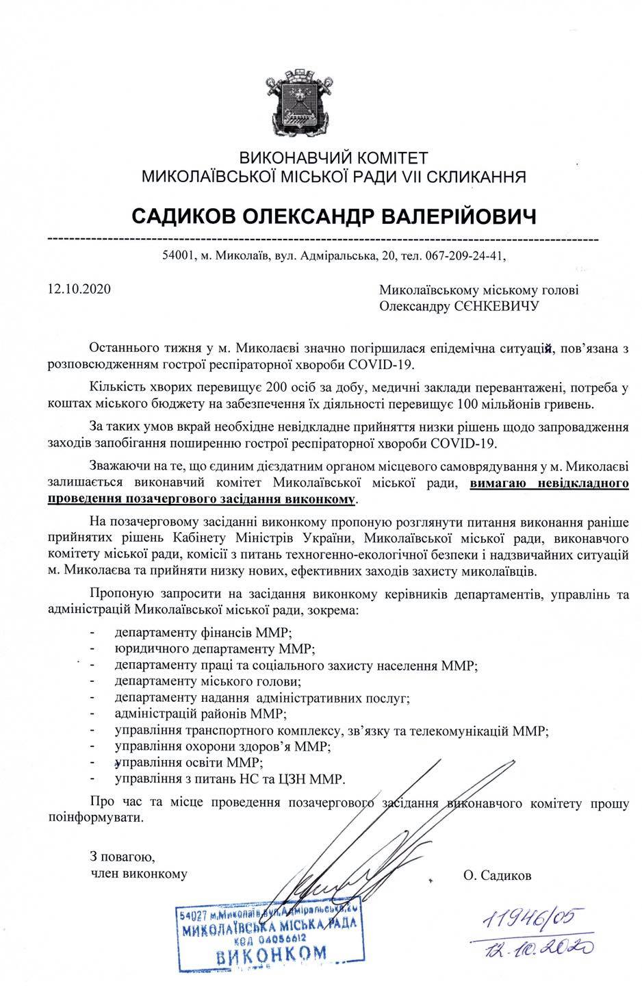 — За последнюю неделю в Николаеве значительно ухудшилась эпидемическая ситуация, связанная с распространением вируса COVID-19. Количество больных превышает 200 человек в сутки. Медицинские учреждения перегружены. Потребность в средствах на борьбу с COVID-19 превышает 100 миллионов гривен. Единственным дееспособным органом местного самоуправления в г. Николаеве, способным принимать важные для города решения, остается исполнительный комитет Николаевского городского совета. Именно поэтому требует безотлагательного проведения внеочередного заседания исполкома для принятия решений, направленных на предотвращение распространения пандемии, — призвал Александр Садыков.