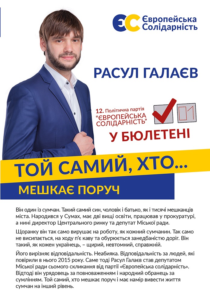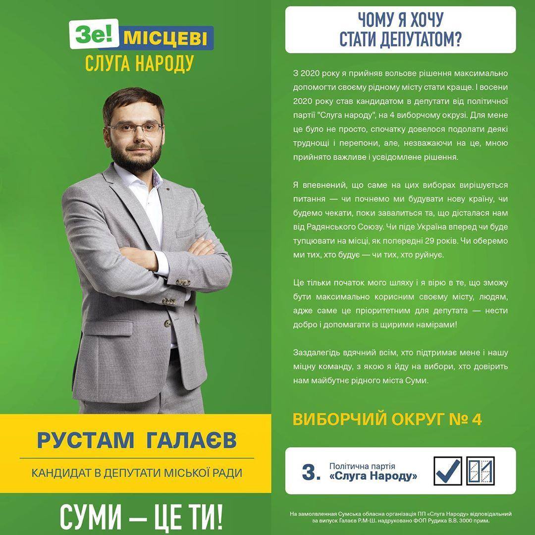 Его сыновья решили не соревноваться с отцом — они борются за пост депутата в Сумском городском совете — это также можно увидеть на сайте ЦИК. Расул Галаев баллотируется от «Евросолидарности», а Рустам — от партии Слуга Народа.