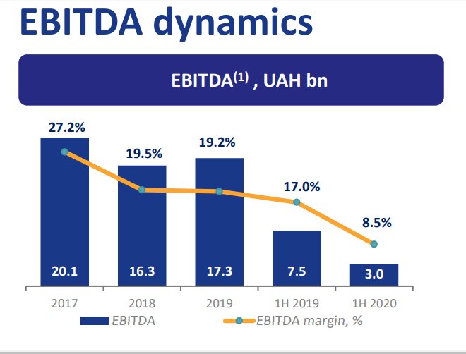 Чистый доход снизился на 19,4% по сравнению с первым полугодием 2019-го и составил 35,6 миллиардов гривен. EBITDA (прибыль до вычета расходов по выплате процентов, налогов, износа и начисленной амортизации) упала до 3 миллирдов гривен(на 59,79%), а маржа EBITDA — с 17% до 8,5%.