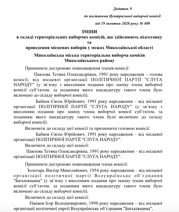 В понедельник, 19 октября, Центральная избирательная комиссия вновь внесла изменения в состав Николаевской городской территориальной комиссии.