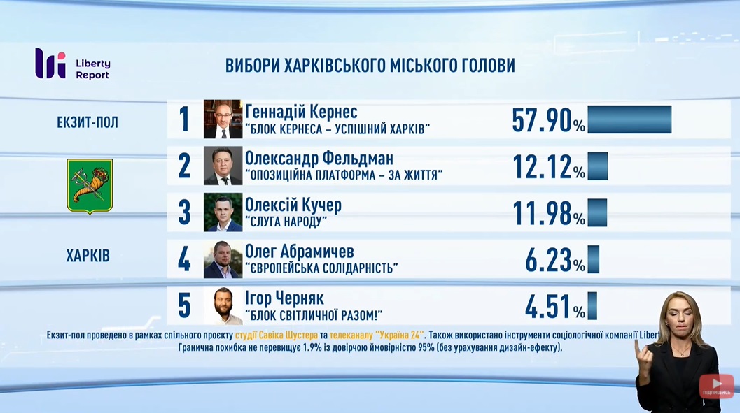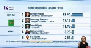 По результатам экзит-пола, организованного в рамках проекта студии Савика Шустера и телеканала «Украина 24», Геннадий Кернес одержал победу в первом туре на выборах Харьковского городского головы.