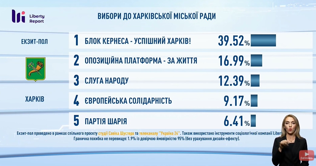 Также, по результатам опроса, партия «Блок Кернеса — Успешный Харьков!» набрал 39,52% голосов на выборах в городской совет. «ОПЗЖ» получила 16,99%, «Слуга народа» — 12,39%.