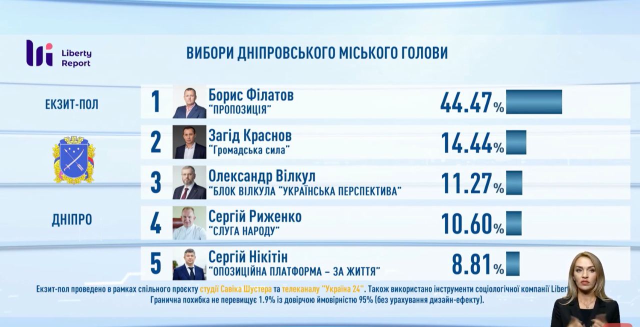 На выборах городского головы Днепра лидирует действующий мэр города Сергей Филатов, свидетельствуют результаты экзит-пола, проведенного совместно «Савик Шустер Студией» и телеканалом «Украина-24 с использованием инструментов социологической компании Liberty Report, оглашенные в эфире телеканала «Украина-24» в воскресенье вечером.
