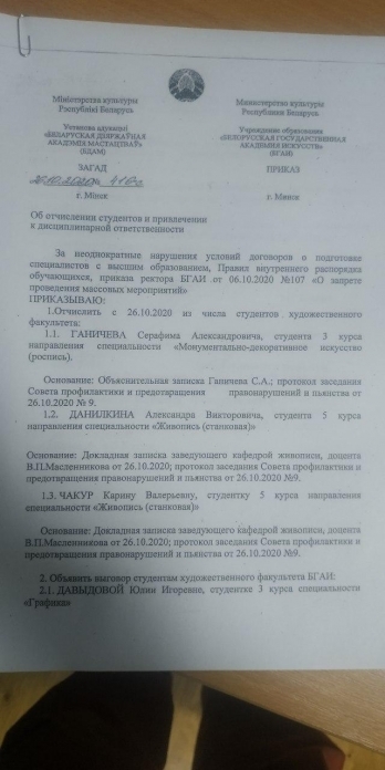 Вечером 27 октября в телеграм-каналах появились фото приказа об отчислении трех студентов БГАИ.