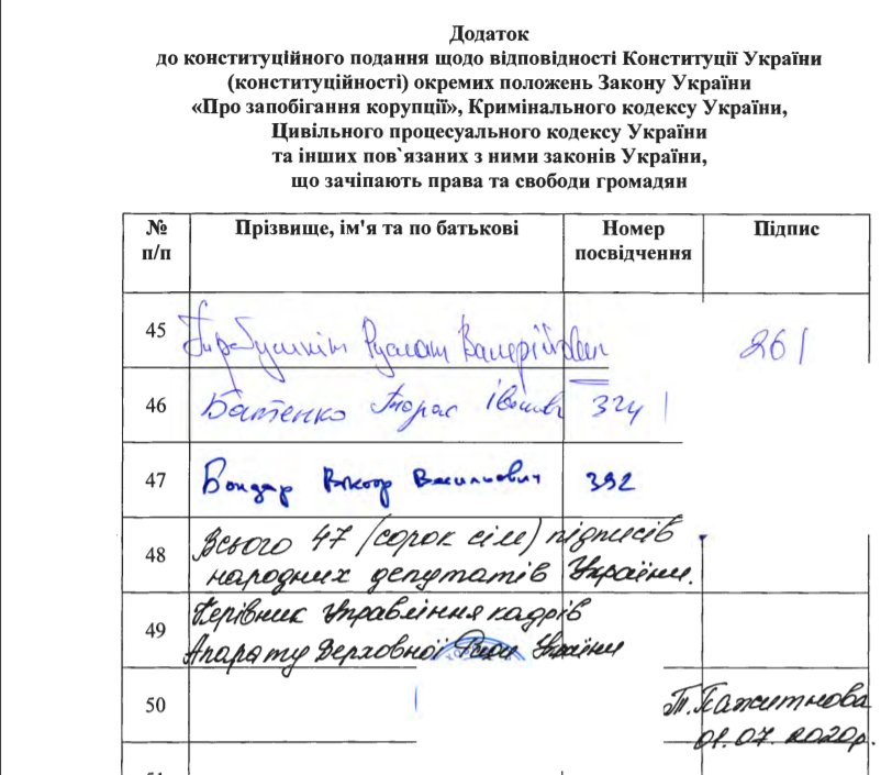 Это обращение было подано в КС 4 августа 2020 года. В нем депутаты от фракции партии Оппозиционная платформа — За жизнь (ОПЗЖ) и депутатской группы За будущее просили суд рассмотреть конституционность отдельных положений Уголовного кодекса, Гражданского процессуального кодекса, а также ряда законов (О предотвращении коррупции, О прокуратуре, О Национальном антикоррупционном бюро Украины, О Государственном бюро расследований, О Национальном агентстве Украины по вопросам выявления, розыска и управления активами, полученными от коррупционных и других преступлений).