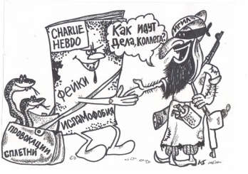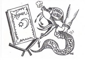 На первом рисунке изображена змея, на которой написано название журнала и «исламофобия». Она шипит на Коран, пока ее душит человеческая рука.
