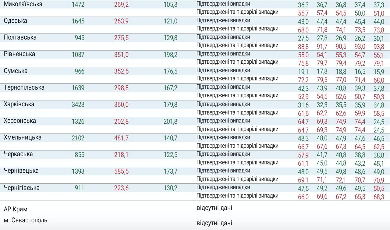 Отмечается, что самый высокий показатель заболеваемости COVID-19 за 14 дней зафиксирован в Черновицкой (585,5 на 100 тыс. человек), Житомирской (492,3) и Хмельницкой (481,7) областях.