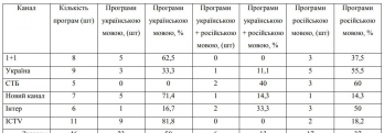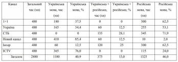 За это время активисты получили такие данные: на украинском языке программы шли 19 часов 40 минут (41% времени), программы на украинском и на русском языке – 6 часов 15 минут (13% времени), программы на русском языке – 22 часа 05 минут (46% времени ).