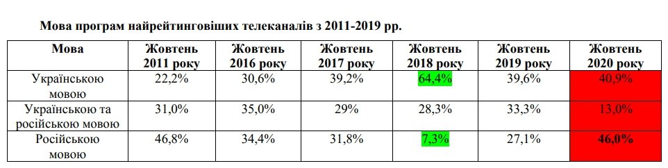 В 2020 году доля русского языка на шести самых популярных национальных телеканалах Украины выросла до 46%.