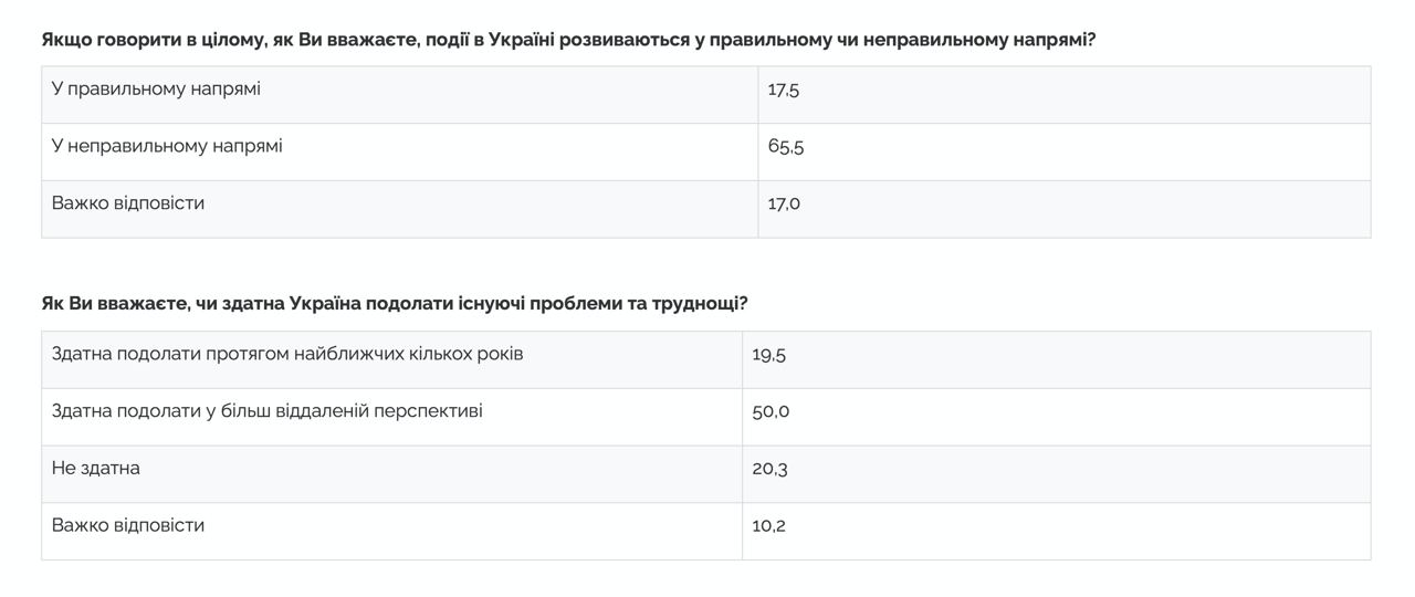 19,5% украинцев верят, что Украина способна преодолеть существующие проблемы и трудности на протяжении ближайших нескольких лет. 50% считают, что Украина сможет преодолеть проблемы в более отдаленной перспективе, а 20% - что Украина не способна преодолеть существующие проблемы (остальные не определились).