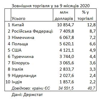 По итогам 9 месяцев 2020 года доля Китая во внешнем обороте Украины (экспорт и импорт товаров и услуг) составила 12,9% (10 854,7 млн долларов). В первом квартале его доля была на уровне 10,9%, по итогам первого полугодия - 12,5%.