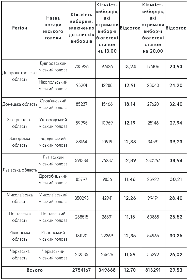 Во Львове явка составила 38,94%, в Славянске — 32,40%, в Киеве — 30,35%, Дрогобыче — 30,21%, Николаеве — 28,40%, Ужгороде — 27,94%, Черкассах — 26,02%, Полтаве — 25,52%, Никополе — 24,20%, Днепре — 23,93%.