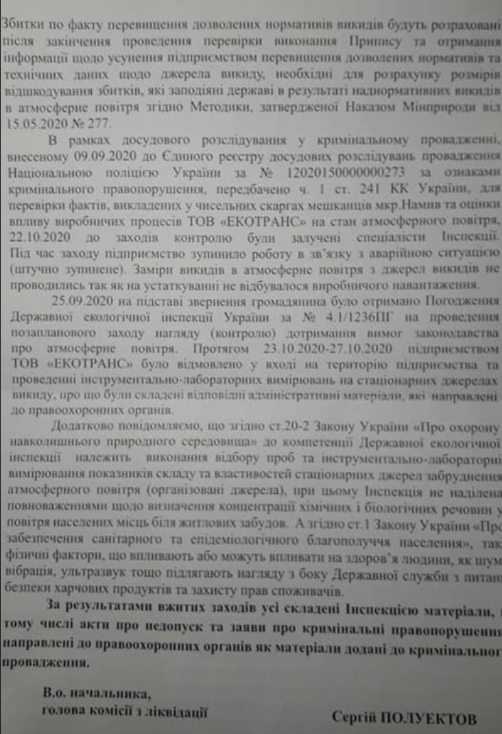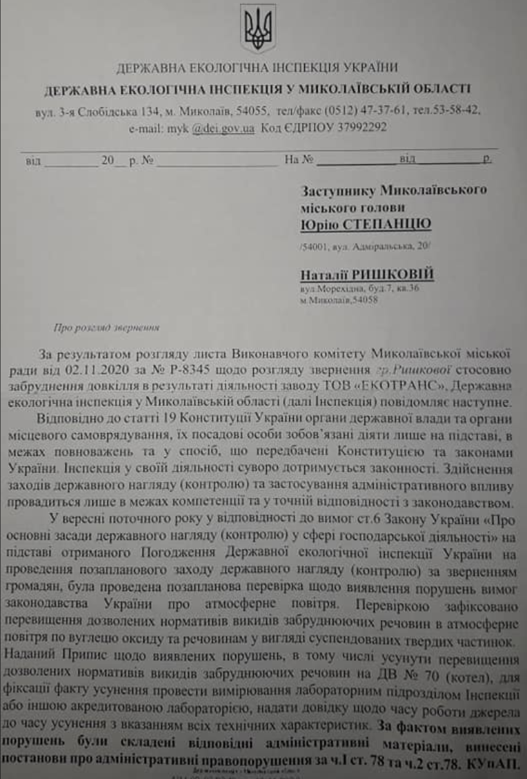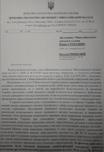 Об этом говорится в ответе Госэкоинспекции вице-мэру Николаева Юрию Степанцу, который опубликовала координатор общественной организации «Місто Сонця» Наталья Ришакова на своей странице в Facebook.