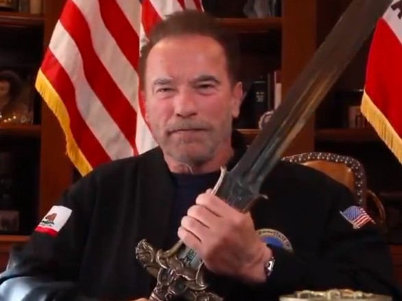 Бывший губернатор Калифорнии появился на видео за письменным столом, на котором лежит меч из картины «Конан-варвар» (Conan the Barbarian, 1982), главная роль в котором принесла ему славу киноактера.