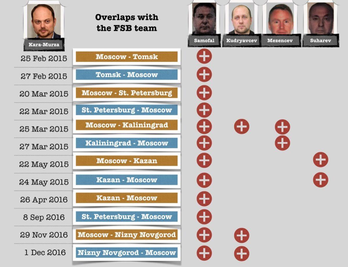 Журналисты обнаружили ряд доказательств, что специалисты «бригады отравителей» сопровождали Владимира Кара-Мурзу в региональных поездках или перелетах. Издание утверждает, что такое большое количество совпадений перестает быть простыми совпадениями, а превращается в логическую цепочку, подтвержающую замешанность российских силовых ведомств в политических убийствах.