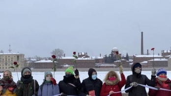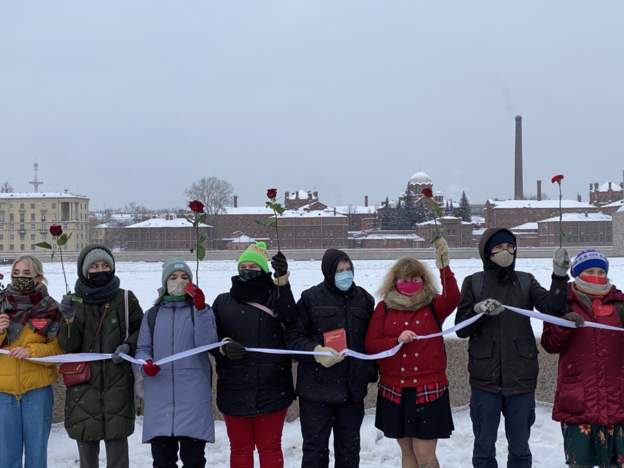 В Петербурге около 70 активистов выстроились у памятника жертвам политических репрессий с белой лентой, красными цветами и сердечками с именами политзаключенных.