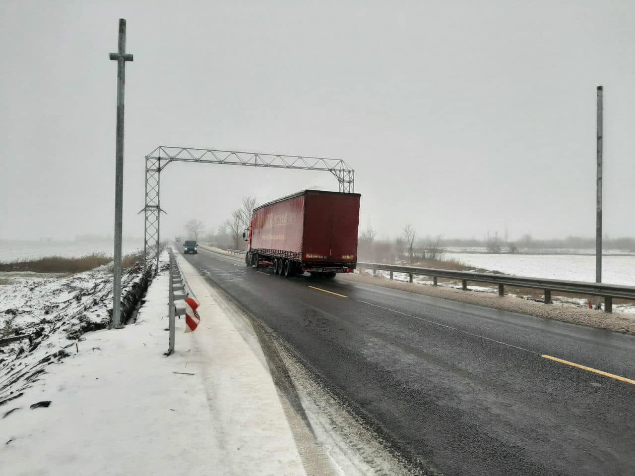 В Службе автодорог рассказали, что на сегодняшний день выполнены основные работы, в частности, монтаж главной конструкции-арки, на которой будет размещено оборудование с датчиками измерения габаритов транспорта, и вспомогательная конструкция, на которой разместят 6 камер трех типов: для общего осмотра, определения номеров и кругового обзора.