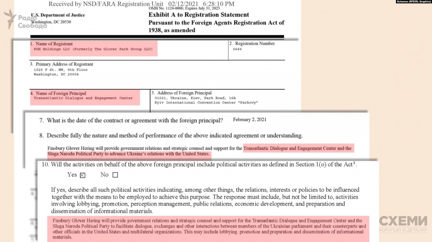 Общественная организация «Центр трансатлантического взаимодействия и диалога", учредителями которой являются помощники двух нардепов из фракции «Слуга народа», в феврале подписала контракт с американской компанией «Finsbury Glover Hering».