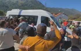 По информации журналистов, агрессивно настроенные граждане забросали микроавтобус главы государства камнями и разбили одно из окон автомобиля.