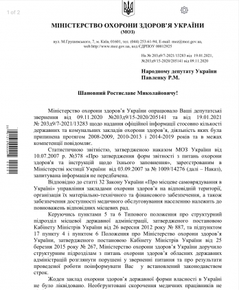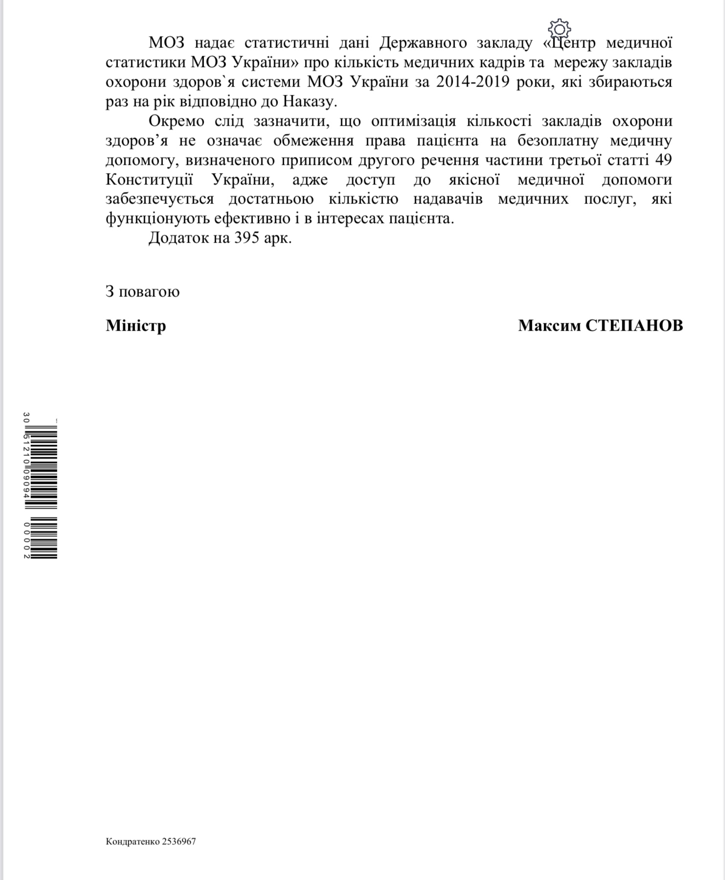 Он процитировал официальный ответ МОЗ за подписью Степанова: «Ни одно учреждение здравоохранения государственной формы собственности в Украине не было ликвидировано. Необоснованные сокращения медицинских работников не производились».