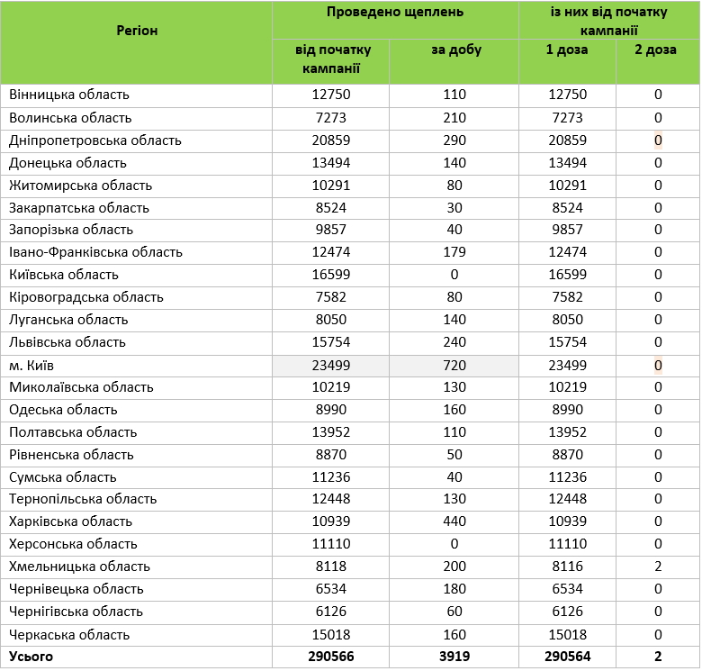 В целом по Украине за прошлые сутки было привито 3919 человек. Всего с начала кампании вакцину получили 290 тысяч 566 украинцев.