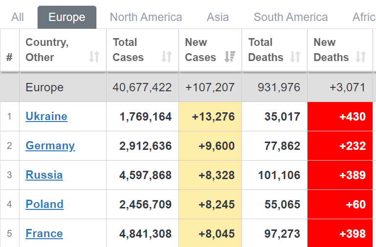 Вчера правительство Украины сообщило о 13 276 новых случаях коронавируса. Это оказался наивысший на континенте показатель по данным Worldometers. Первая пятерка лидеров антирейтинга выглядит так: