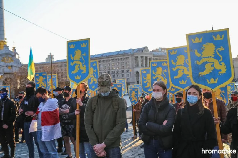 Вечером 28 апреля по центру Киева прошлась колонна из нескольких сотен человек в вышиванках и с символикой СС Галичина. Из-за возможных провокаций участников демонстрации по периметру охраняли полицейские и нацгвардейцы.