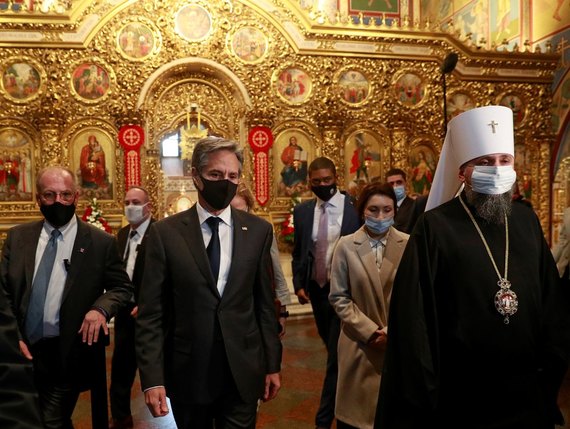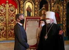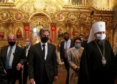 Еще до встречи с президентом Владимиром Зеленским госсекретарь США Энтони Блинкен посетил Михайловский собор в Киеве. Его гидом сегодня был предстоятель ПЦУ митрополит Епифаний.