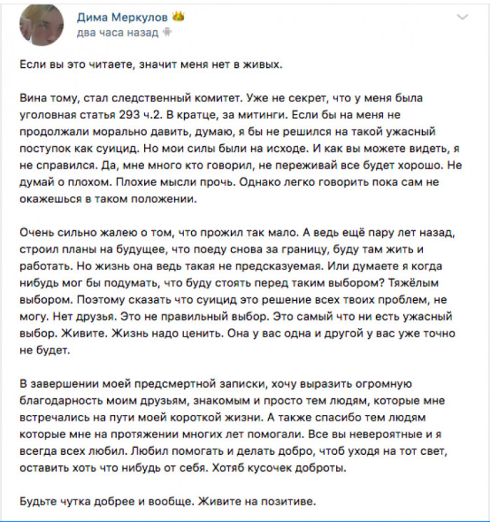 — Если бы на меня не продолжали морально давить, думаю, я бы не решился на такой ужасный поступок как суицид…Сильно жалею, что прожил так мало, — говорится в последней записке.