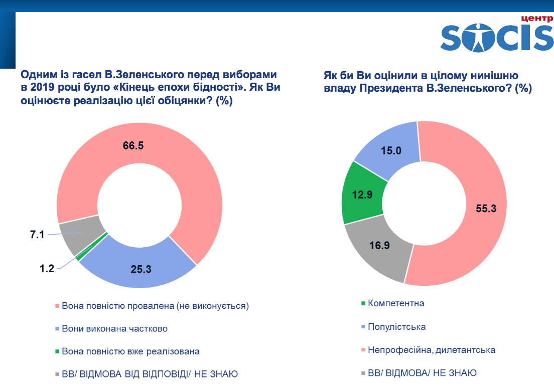 Кроме того, 66,5% респондентов ответили, что выполнение предвыборного обещания президента Владимира Зеленского «Конец эпохи бедности» полностью провалено, 25,3% — считают, что оно выполнено частично, 1,2% — считают, что оно полностью выполнено.