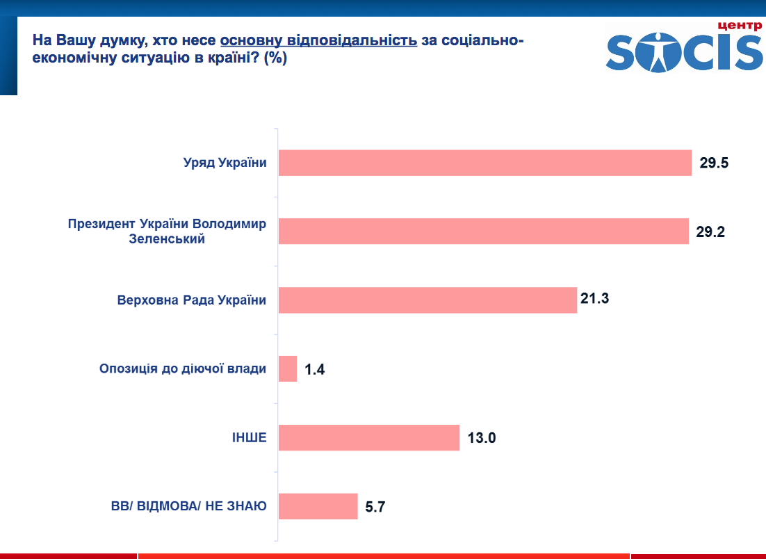 Вместе с тем, 29,5% граждан считают, что основную ответственность за социально-экономическую ситуацию в стране несет правительство, 29,2% — президент, 21,3% — Верховная Рада.