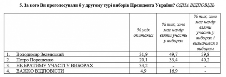 В частности, при моделировании второго тура выборов президента с участием Владимира Зеленского и Порошенко за первого кандидата отдали бы свои голоса 60% избирателей, за второго — 40%. Речь идет о тех избирателях, которые точно приняли бы участие в голосовании.