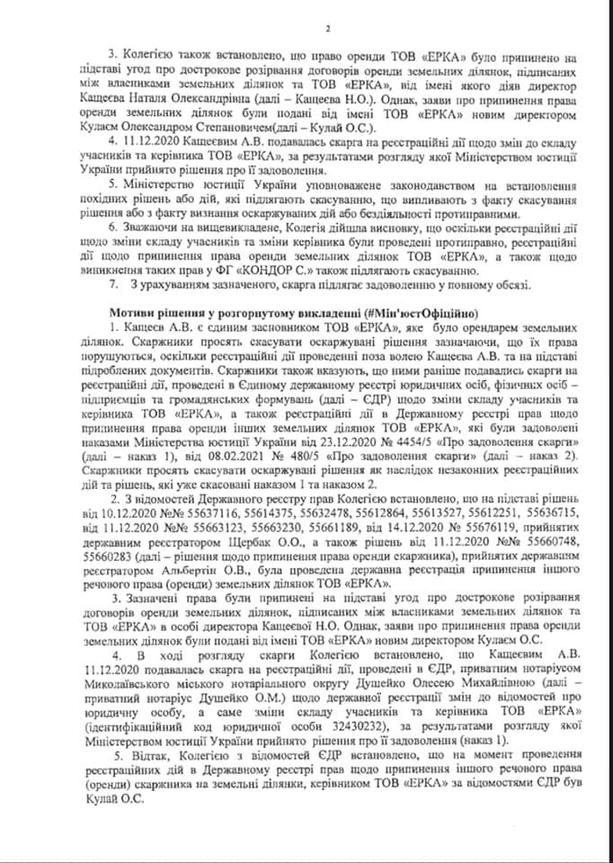 «При этом, он подал в суд сфальсифицированный пакет документов - поддельные документы, подписи и печати. Решать вопросы в судах ему помогают нардеп Негулевский Игорь и Давид Apаxамия. То есть, они пошли против своего коллеги - Министра юстиции Украины и подконтрольного ему ведомства. Видимо, шальные и дармовые деньги затмили их разум. Сейчас это не проблема. Звонят «свыше» главе суда и просят об услуге. Он в свою очередь напрягает или заинтересовывает судью, которая рассматривает дело. А последняя, говорит на белое - чёрное и выносит нужное решение. Так вот. После разговора с Негулевским, Министр юстиции Денис Малюська действительно разобрался в ситуации, и своим приказом вернул ещё 50 га сельскохозяйственных земель законным арендаторам ООО «Ерка». А в это время, Негулевский продолжает бегать по Раде, разносить сплетни и выдавать желаемое за действительное», - написал Денис Жело.