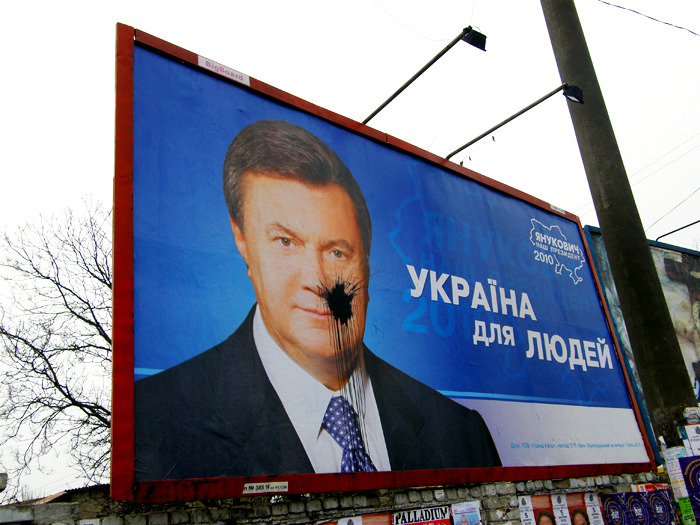 «Порча», которая началась с того, что на низко размещенном биг-борде на Пушкинском кольце в Николаеве от портрета Виктора Януковича оторвали пол-лица, сим же и не закончилась. Сначала она распространилась на другой борд на том же кольце – так как он размещен несколько выше, в Януковича зарядили черной краской, попав в «многострадальную» нижнюю часть лица.