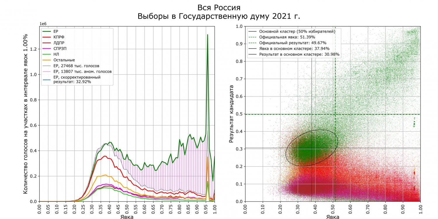 Электоральный эксперт собрал подборку данных с 96806 участков (107, 9 миллионов избирателей) и пришел к выводу, что масштаб вкинутых бюллетеней достигает 13,8 миллионов голосов.
