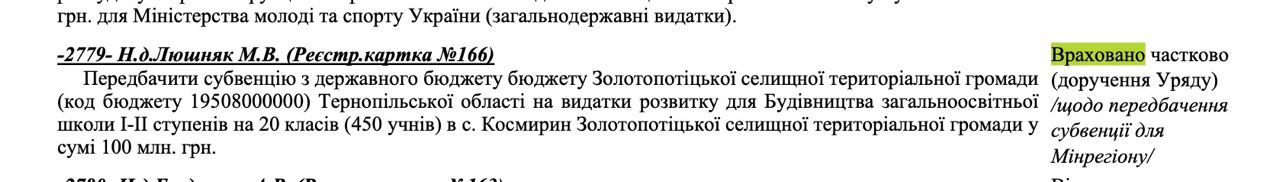 Народный депутат предложил выделить из государственного бюджета 100 миллионов гривен на строительство общеобразовательной школы І-ІІІ ступеней на 20 классов (450 учеников) в селе Космирин.