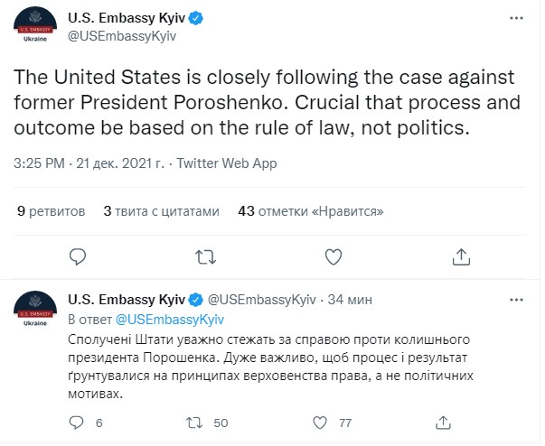 В своем посте в Twitter посольство США в Киеве призвало украинские власти руководствоваться в этом деле принципами верховенства права.